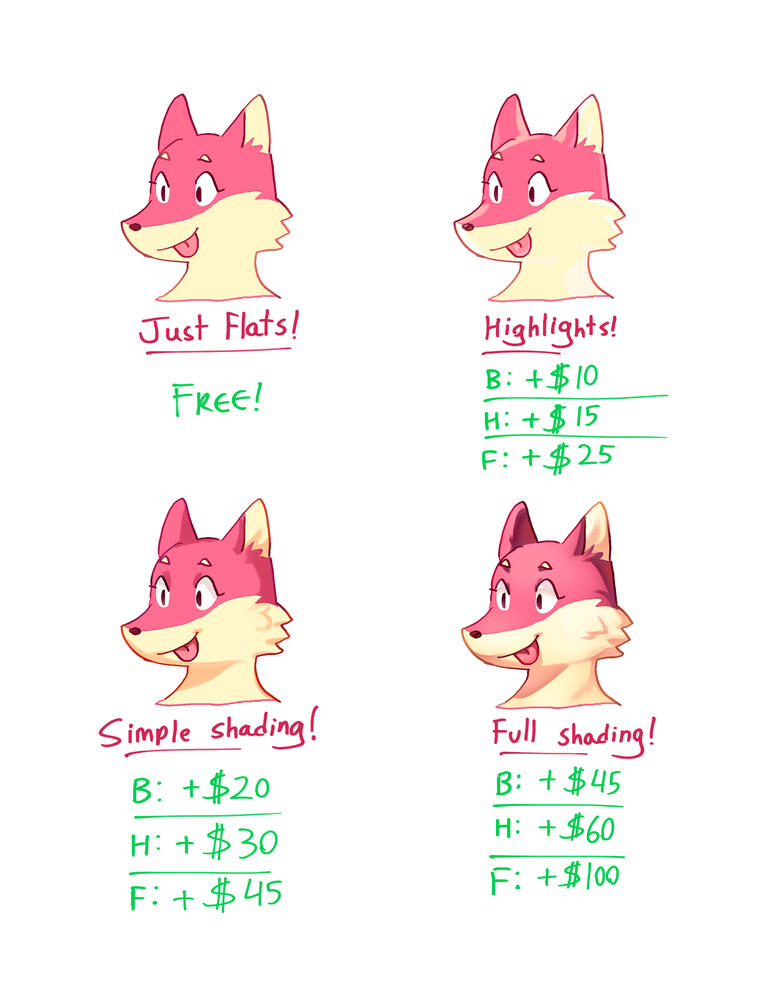 Simple shading: the character will have consistent 'cel' shading, however there will be no use of reflective light or soft brushes to create additional depth. Will add an additional cost of $20 (bust), $30 (half) or $45 (full).