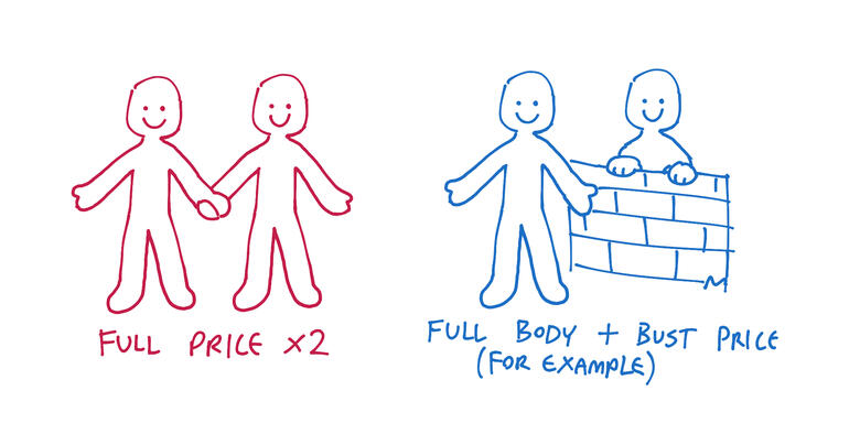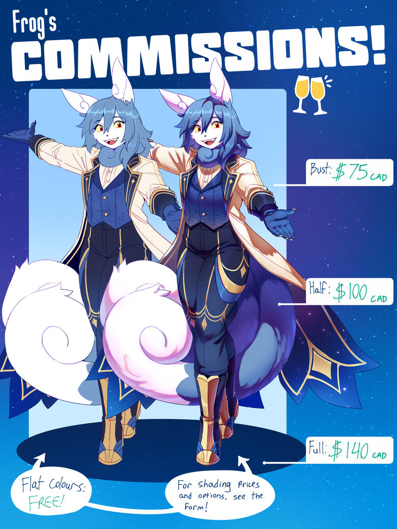 Extra characters will be full price unless significantly cut off by the composition. For example, a flat-coloured piece with two characters standing side by side, fully in frame ($140 each) would cost $280, but if one of the characters was significantly covered by a prop or part of the scenery, they would be treated as a half character ($100) and the total price would come down to $240.