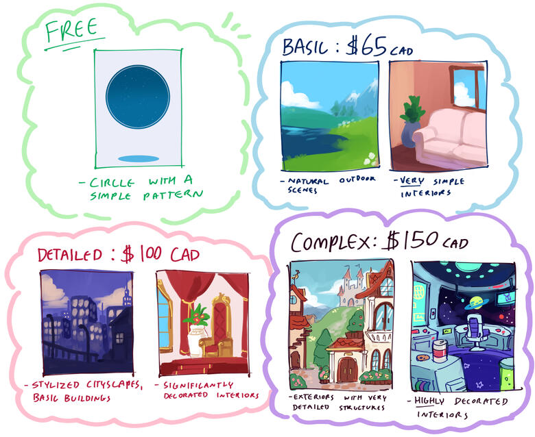 COMPLEX ($150): outdoor scenes involving elaborate structures (eg. a fantasy castle town or a crowded amusement park) or extremely busy interiors (eg. an extravagant, fully-furnished bedroom or a sci-fi spaceship interior with a lot of machinery and tech stuff) will count as complex backgrounds. As mentioned before, a fully natural scene may count as this if it involves a ton of flowers or other plants.