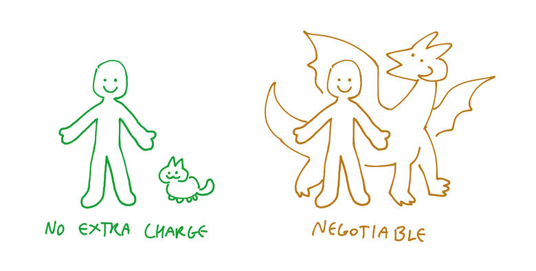 Simple, small extra characters such as pets are treated more as props and will be no extra charge. Larger or more detailed animals have no set prices and are negotiable.